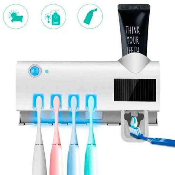* Soporte Esterilizador UV Para cepillos de dientes con Dispoensador de crema dental.* Excelente herramienta para uso doméstico en el baño. * Sensor de movimiento que detecta la presencia humana este evita que la luz UV se active durante el uso.* Interruptor de encendido. * Permite que tu cepillo de dientes esté limpio y libre de todo tipo de microorganismos gracias al sistema de esterilización UV que elimina hasta el 99.9% de gérmenes.* Práctico y fácil de usar, no más desperdicio de pasta de dientes ya que cuenta con un dispensador dosificador adicional * Puede contener cuatro cepillos de dientes.* Viene con una almohadilla adhesiva adjunta para facilitar la instalación en varios tipos de paredes, opcional instalar con chazos para mayor seguridad y fijación en la pared. * Se carga con cable USB anexo.* Trae panel solar para carga.